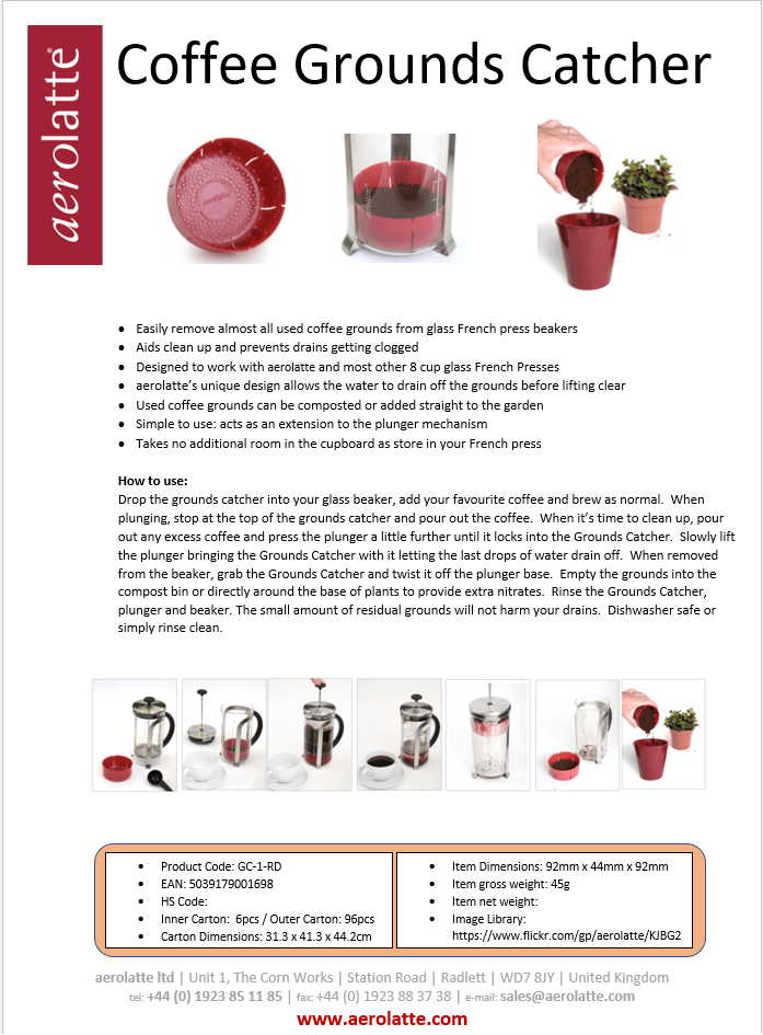 Aerolatte’s Grounds Catcher lifts out almost all of the used coffee grounds from the bottom of most glass 8-cup French Press Coffee Makers. Easily lift out used grounds for less time and effort spent cleaning. Unique design allows water to drain from the grounds for less mess; acts as an extension to the plunger for easy extraction from the beaker. Dishwasher safe or simply rinse clean. Made from BPA-free plastic, Aerolatte’s Grounds Catcher is sturdy, durable, and dishwasher safe for easy cleanup.