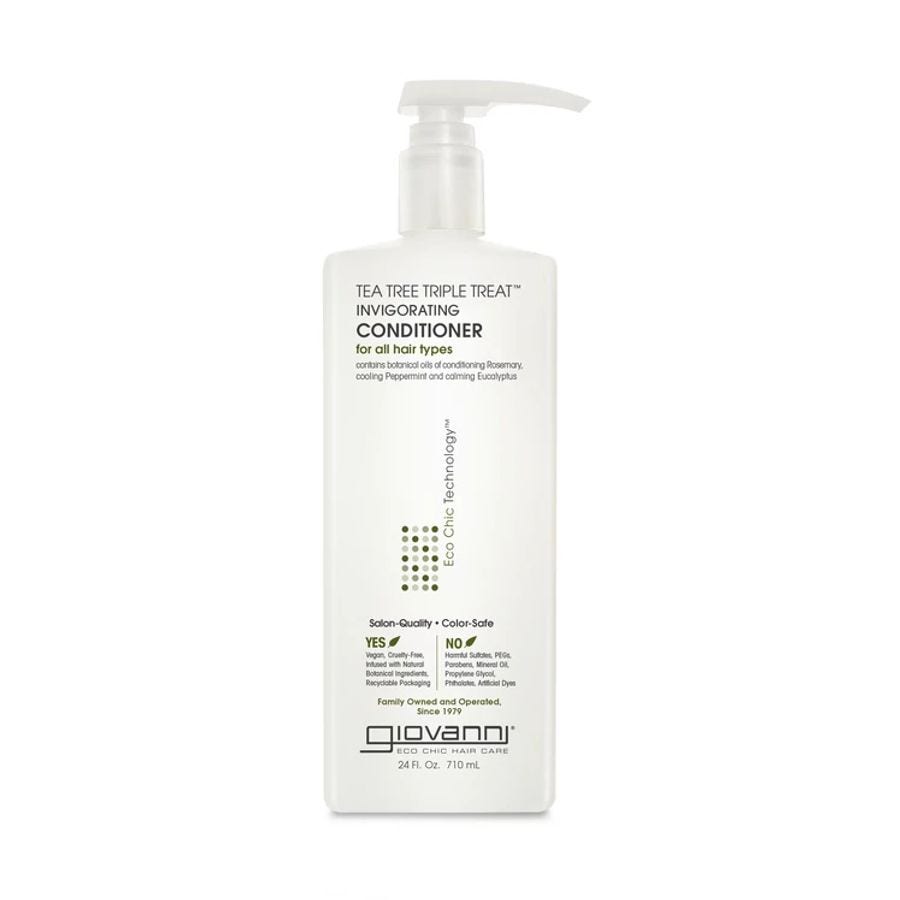 Awaken your scalp and hair follicles with an incredible 3 organic oil blend (cooling peppermint, conditioning rosemary and clarifying eucalyptus) designed to strengthen, calm and condition your hair. Giovanni’s Invigorating Tea Tree Triple Treat Conditioner increases scalp circulation for a refreshed, renewed feel while alleviating dry and flaking scalp.